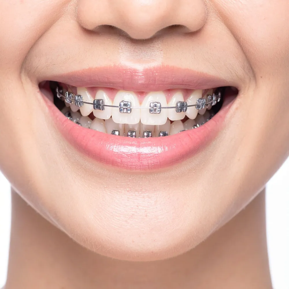 Visible metal or ceramic brackets — noticeable, though modern versions are smaller and sleeker.